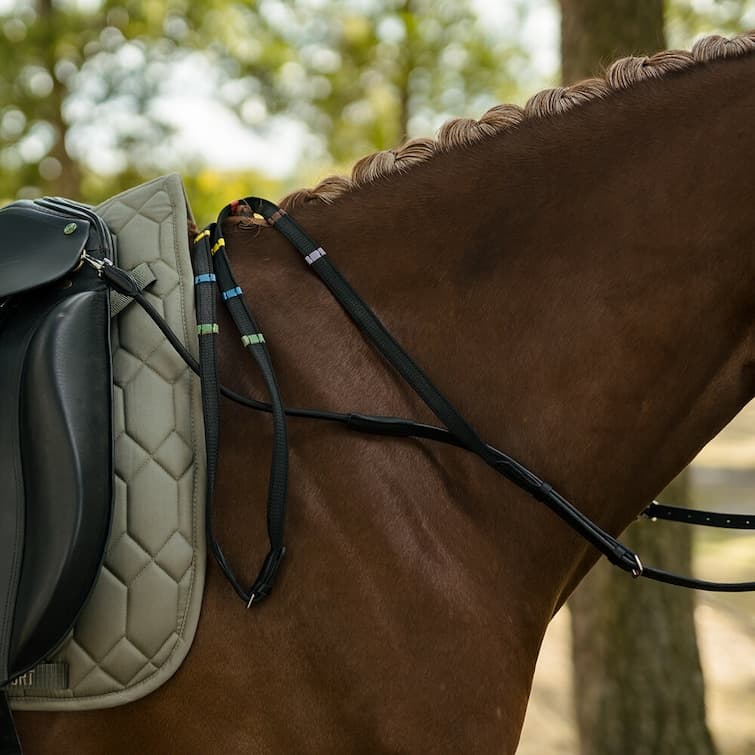 - Hjälptygeln fästs enkelt i sadelns D-ringar med pistolhakar och i sadelgjorden för extra stabilitet.