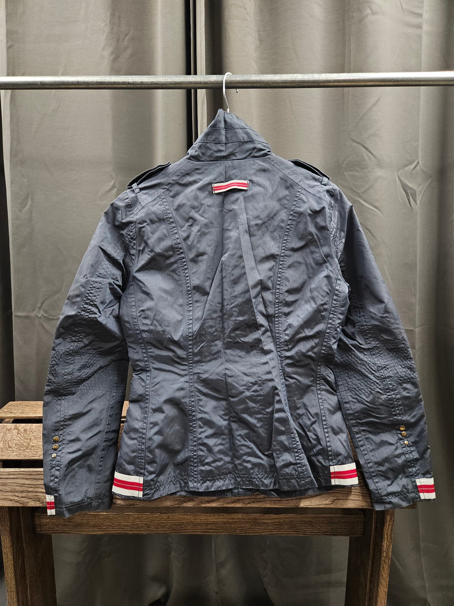 Vindtät, ofodrad jacka i blått med röda detajer.