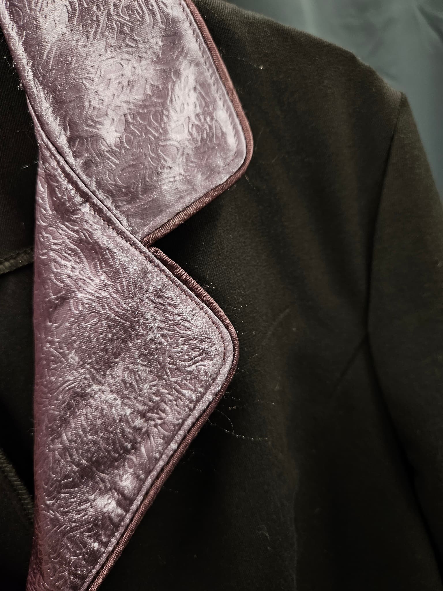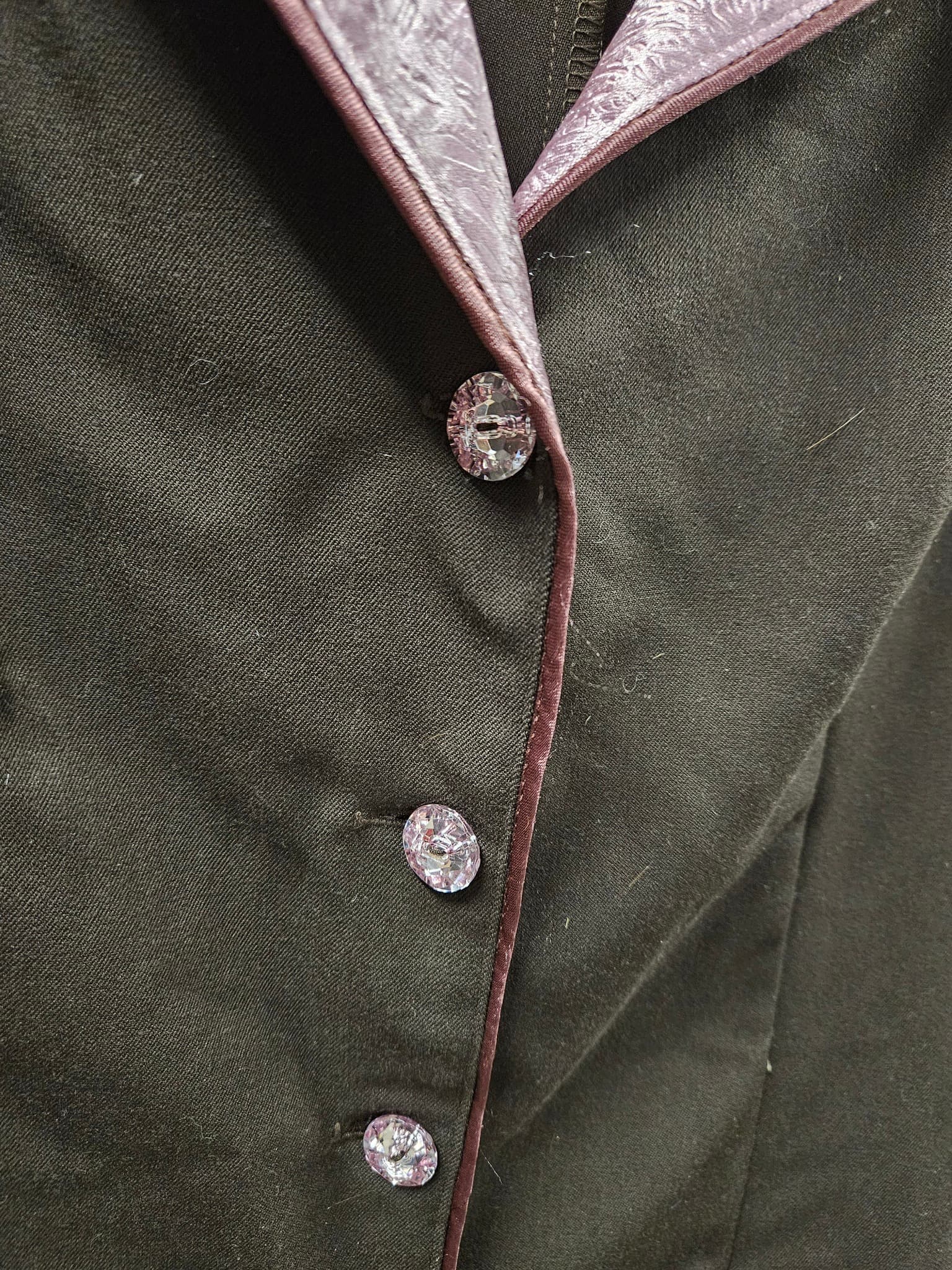 Har lite textilfibrer från det rosa tyget och pipingen, stör inte utseendet såvida man inte synar kavajen.