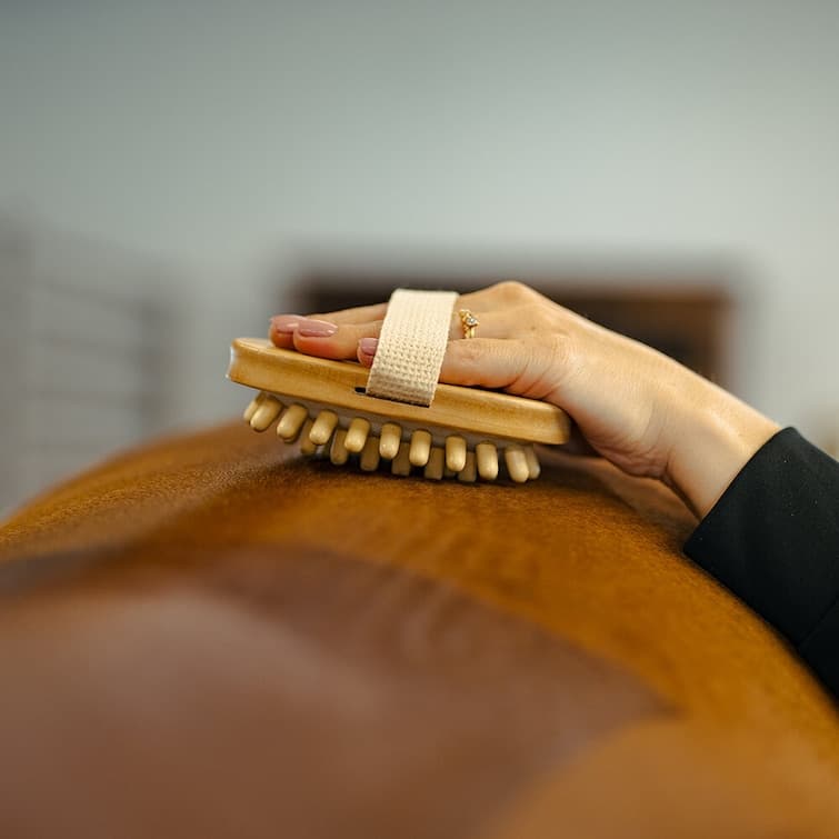 - Massageborsten kan med fördel användas för att massera ut liniment på hästens stora muskelgrupper.