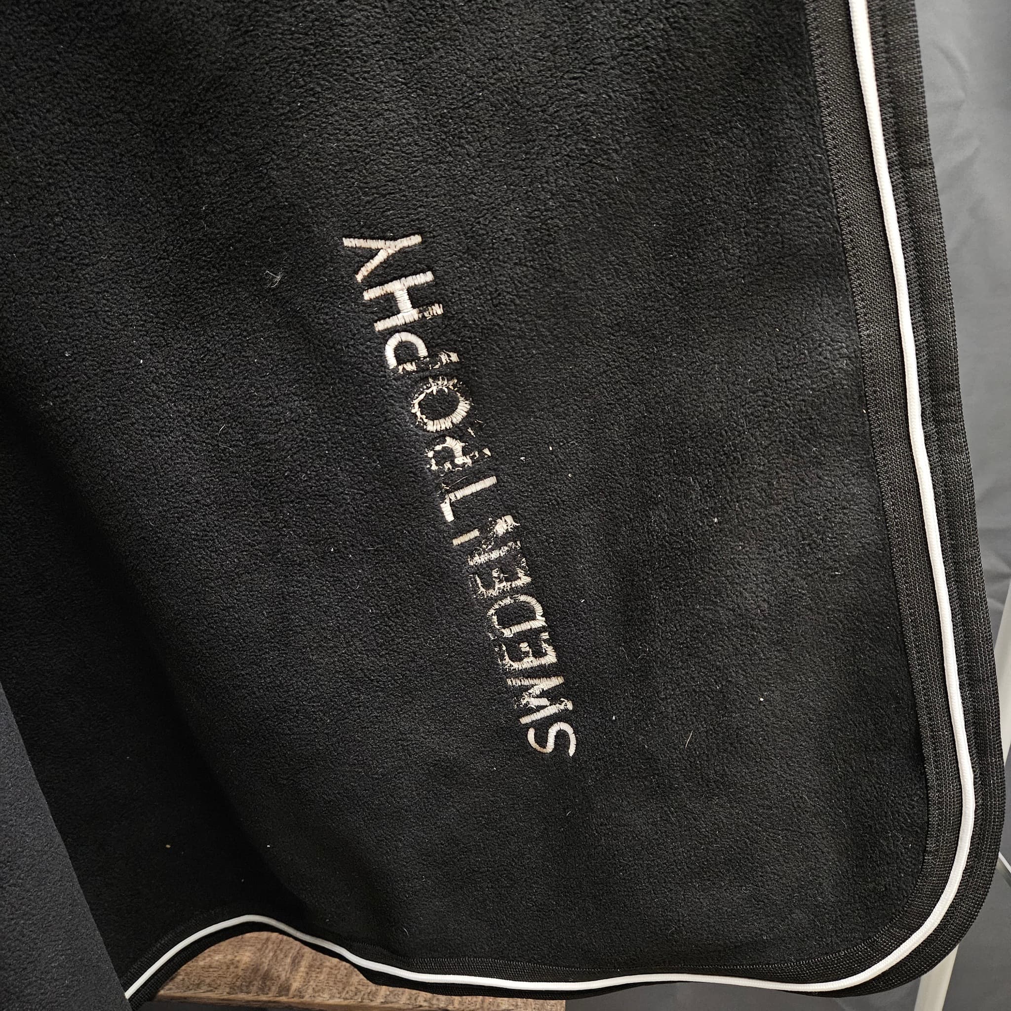 - Broderad med "Dressage Power" och "Sweden Trophy", men brodyren är delvis bortsprättad