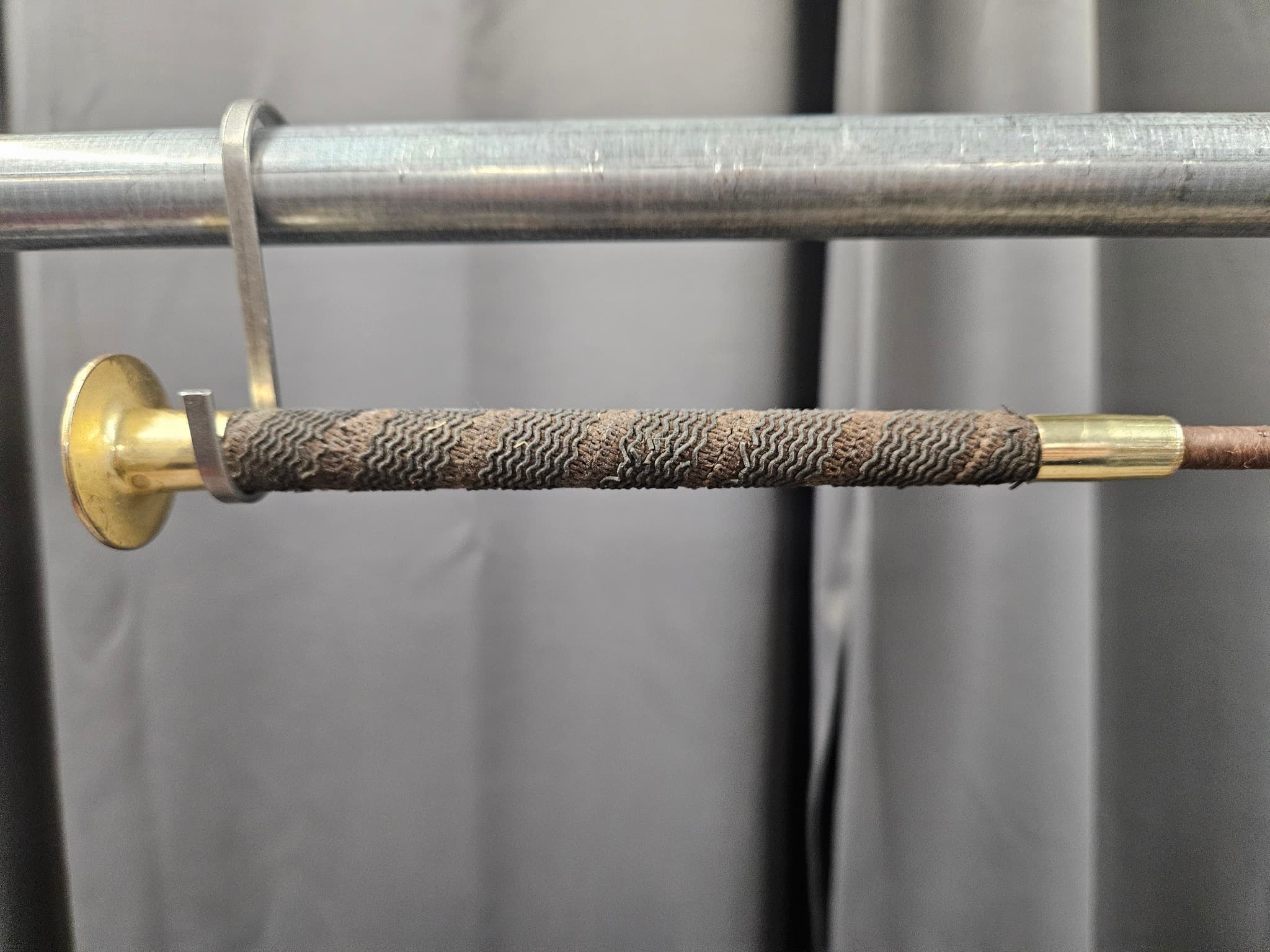 - Brunt med mässingfärgad knopp och läderklatsch