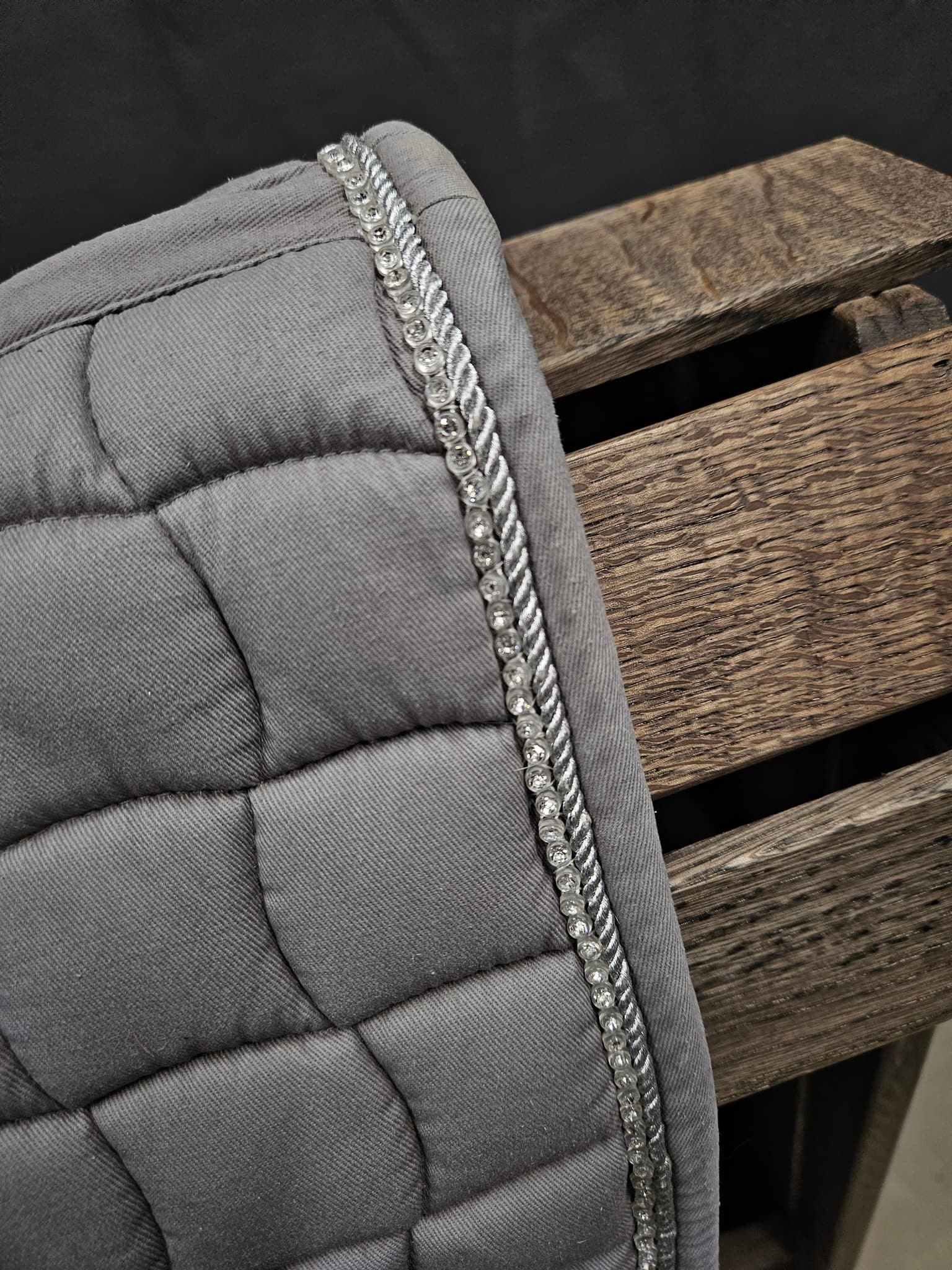 Grått med silvrig passpoal och bling längs bakkant.